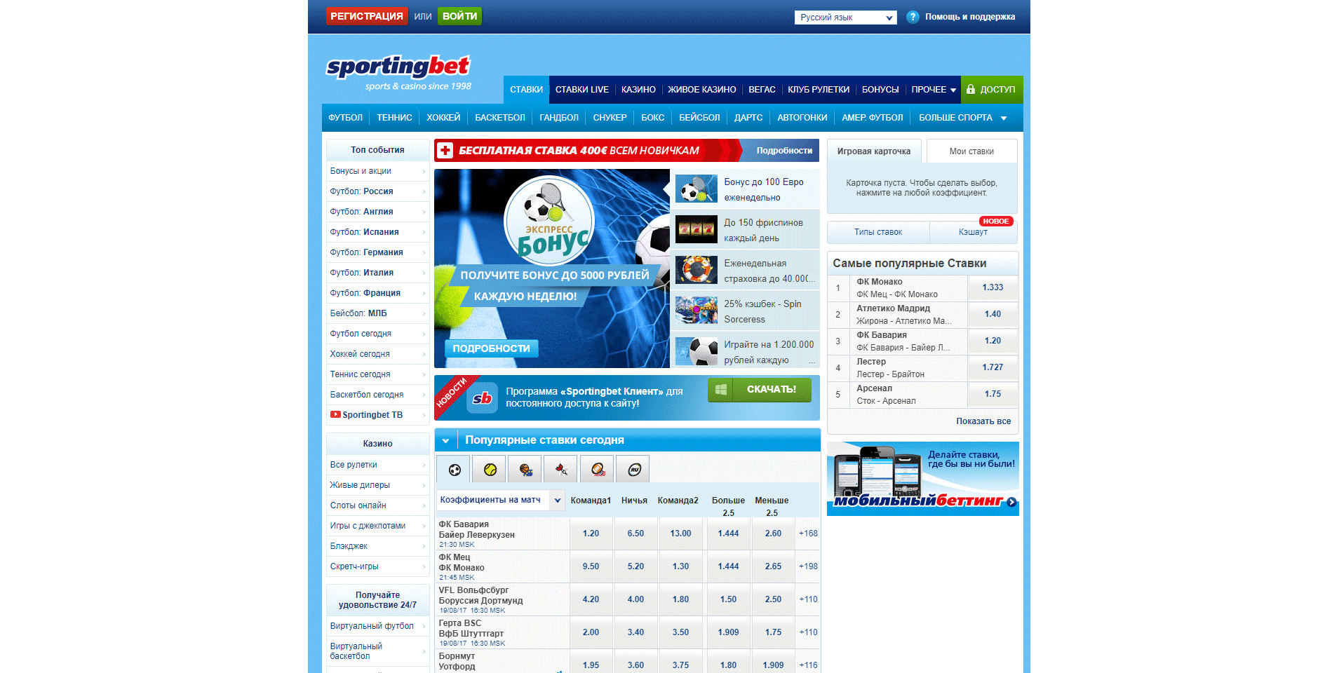 Η ενότητα αθλητικών στοιχημάτων είναι το στολίδι της Sportingbet. Μπορείτε να στοιχηματίσετε σε μια εξαιρετικά ποικίλη ποικιλία αθλημάτων, που κυμαίνονται από δημοφιλή αθλήματα όπως ποδόσφαιρο, beachball, μπάσκετ, χόκεϊ και κρίκετ έως πιο εξειδικευμένα γεγονότα όπως ιπποδρομίες, NASCAR και darts.